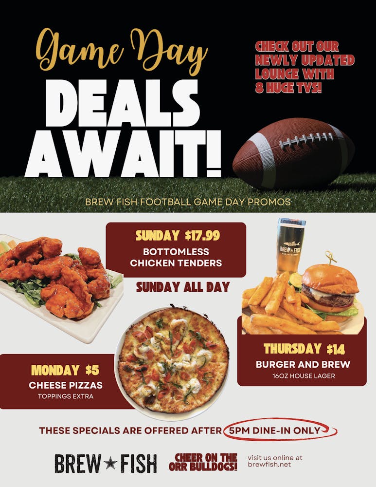Join us at Brew Fish for Football games and great deals! The lounge is newly updated with 8 large screen TVs and comfy seats - grab your crew and head to BREW for some Football action!
